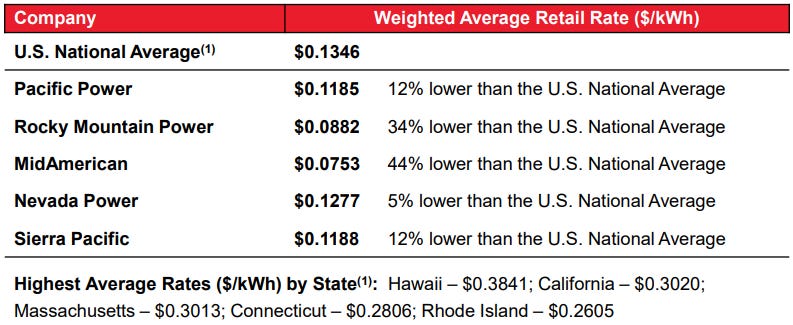These utilities are MidAmerican Energy, Nevada Energy and PacifiCorp. They produce more than 34,000MW of power each year, providing energy substantially below the US national average cost.