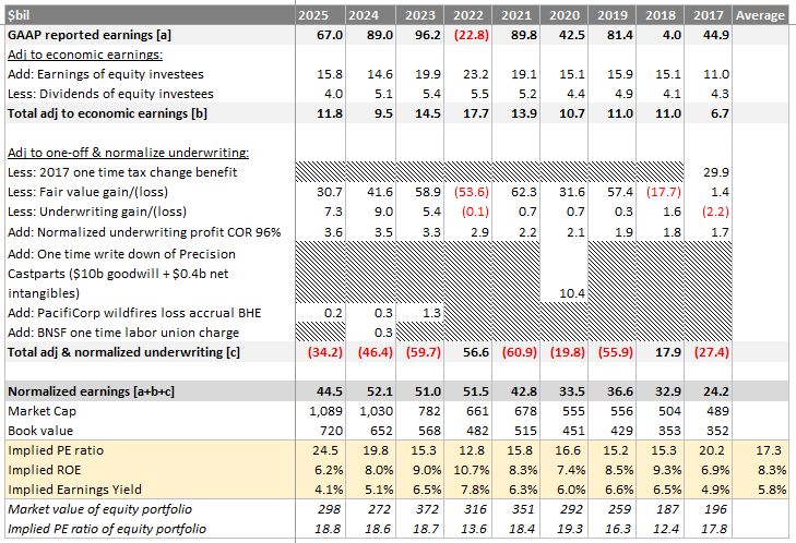 The sum of parts suggest that BRK is likely overvalued at $1,089b market cap. Below is an alternative method to derive normalized earnings and check for multiples.