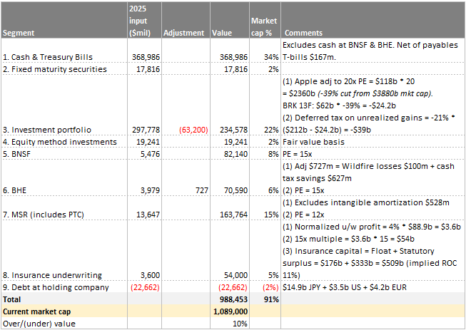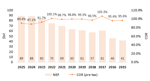 Put together, we assume a normalized COR 96% on NEP $88.9b, and apply a 15x multiple. This approach is different from prior years where we tried to derive the underwriting engine by PV of float, which requires sensitive assumptions (discount rates).