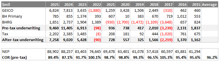 Underwriting profits came in at $6.8b against net earned premiums (NEP) of $44.5b. The combined ratio of 84.7% is unusually good and we don’t expect this to persist. GEICO still operates as the industry’s lowest cost producer at 12.4% expense ratio. For a commoditized product such as car insurance, a low cost operation has durable competitive advantages.