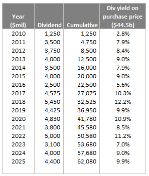 BRK total cash investment totaled $9.8b for 325.4 million shares of Kraft Heinz. As the investment has been accounted for using the equity method, BRK cost basis increased to $13.6b reflecting its proportionate share of Kraft Heinz minus dividends received. In Q3 2025, they had a $5b write-down reducing BRK carrying value from $13.6b to $8.6b.