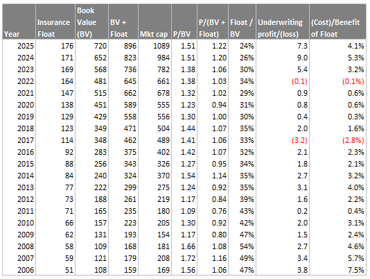 We have mentioned this many times: Although float is a liability in accounting terms, it actually has equity-like characteristics for BRK because of 3 reasons: