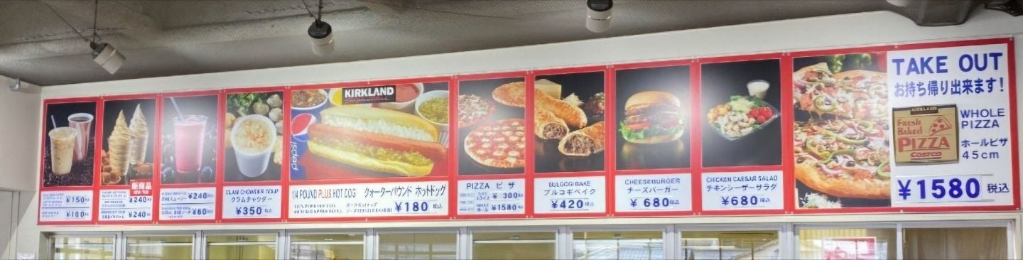 Behind the cashiers is a food court that offers cheap fast food, including the famous $1.50 hotdog pepsi combo and large pizza: