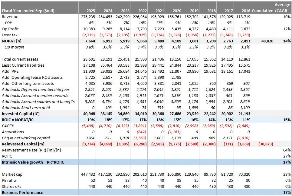 All the above strategies combine to result in high inventory turnover (2017: 11.5x, 2025: 13.2x). It’s a combination of structural choices that drive volume through a streamlined system. This model is born out of necessity because COST manages its inventory with a narrow range of SKU, hence high inventory turnover is a must. This is the reason why COST has much higher ROIC than competitors.