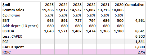 If we give e-commerce 5% operating margins, the ROIC is turns out to be quite healthy: