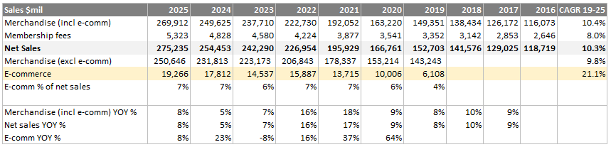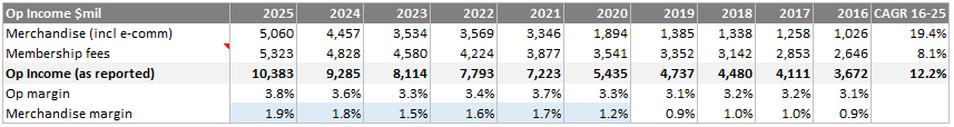 Logically, it’s leveraging on Costco Logistics which already is very efficient. As a result, the merchandise segment’s operating margins doubled from 0.9% (2016) to 1.9% (2025):
