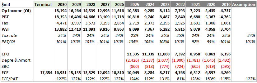 Do a reverse DCF to solve for current $447b market cap, we need the discount rate to be 7% (implied FCF exit multiple = 22x).