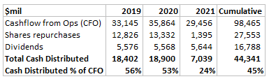 Apparently, Intel didn’t learn their lesson from letting finance executives run the company. Bob Swan joined Intel as CFO in 2016 and was appointed CEO from 2019 to 2021. Another finance background CEO, he returned more cash to shareholders: