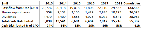 During his tenure, Intel aggressively repurchased shares and paid dividends. Cumulatively, 41% of operating cash flow was returned to shareholders instead of reinvested into Intel’s manufacturing capabilities: