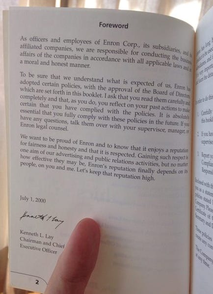To add insult to injury, Enron imploded in an accounting fraud which at that time was the largest bankruptcy in US history. Ironically Enron published a 64-page booklet called “Enron Code of Ethics”. The foreword was such a joke: