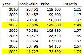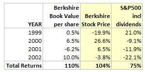 At the time (2002), Berkshire’s shares were trading at ~1.7x book value. After tech stocks got killed, it was Berkshire’s turn to became expensive.