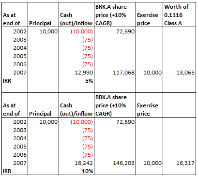 The total issuance was $400m carrying a negative interest rate in exchange for the right to purchase either 0.1116 Berkshire Class A or 3.348 Class B shares for $10,000 share prior to 15 May 2007.