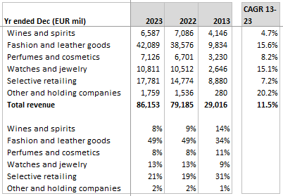 The fashion & leather goods (FLG) segment produces nearly half of total revenues and also reports the highest operating margins of 40%.