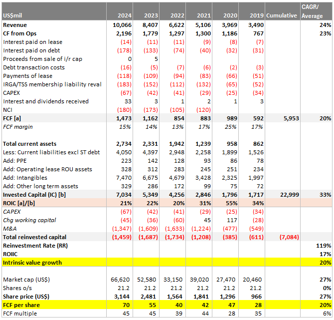 Put together, for the last 6 years the ROIIC is 17% and RR is 119%, producing intrinsic value CAGR of 20%. This aligns with FCF per share CAGR of 20%, the remaining 6% came from FCF multiple expansion, adding up to ~27% share price CAGR.