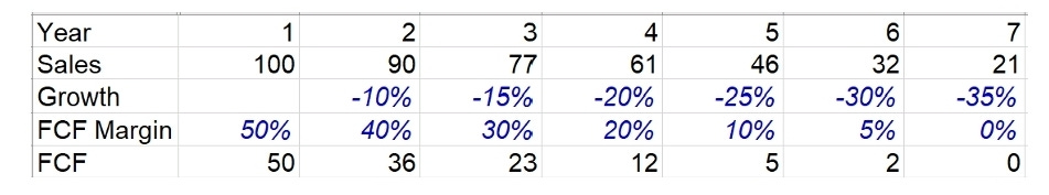 Consider a business that shrinks over time and eventually produces zero free cashflow (FCF):