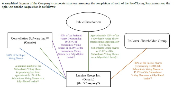 CSU spins out shares of Lumine as dividend in-kind. CSU shareholders receive 63.6 million subordinate voting shares in Lumine, this are the common shares.