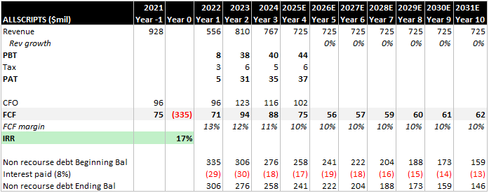 In 2021, Allscripts had revenues of $928m and EBITDA of $145m (15.7% margins). Then in 2022, it generated $71m of free cashflows, so the price paid was 10x forward FCF. This is not cheap and could not have passed the IRR hurdle rates given that Allscripts has a EBITDA margin profile in the mid-teens.